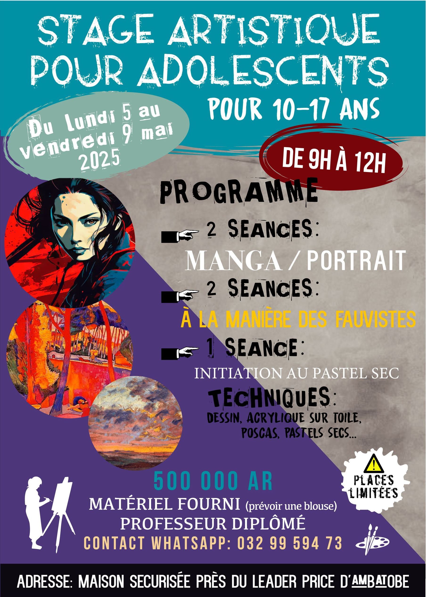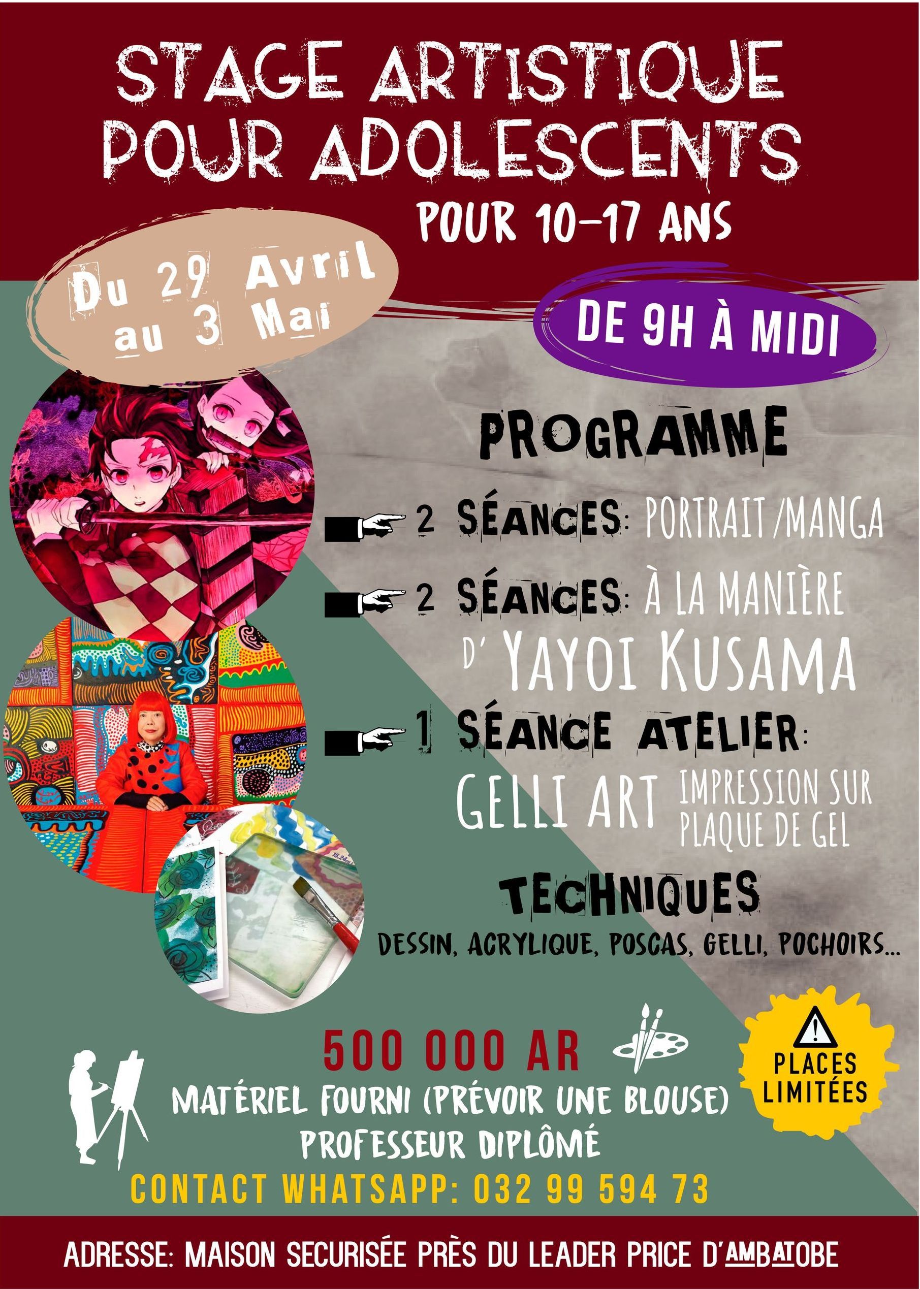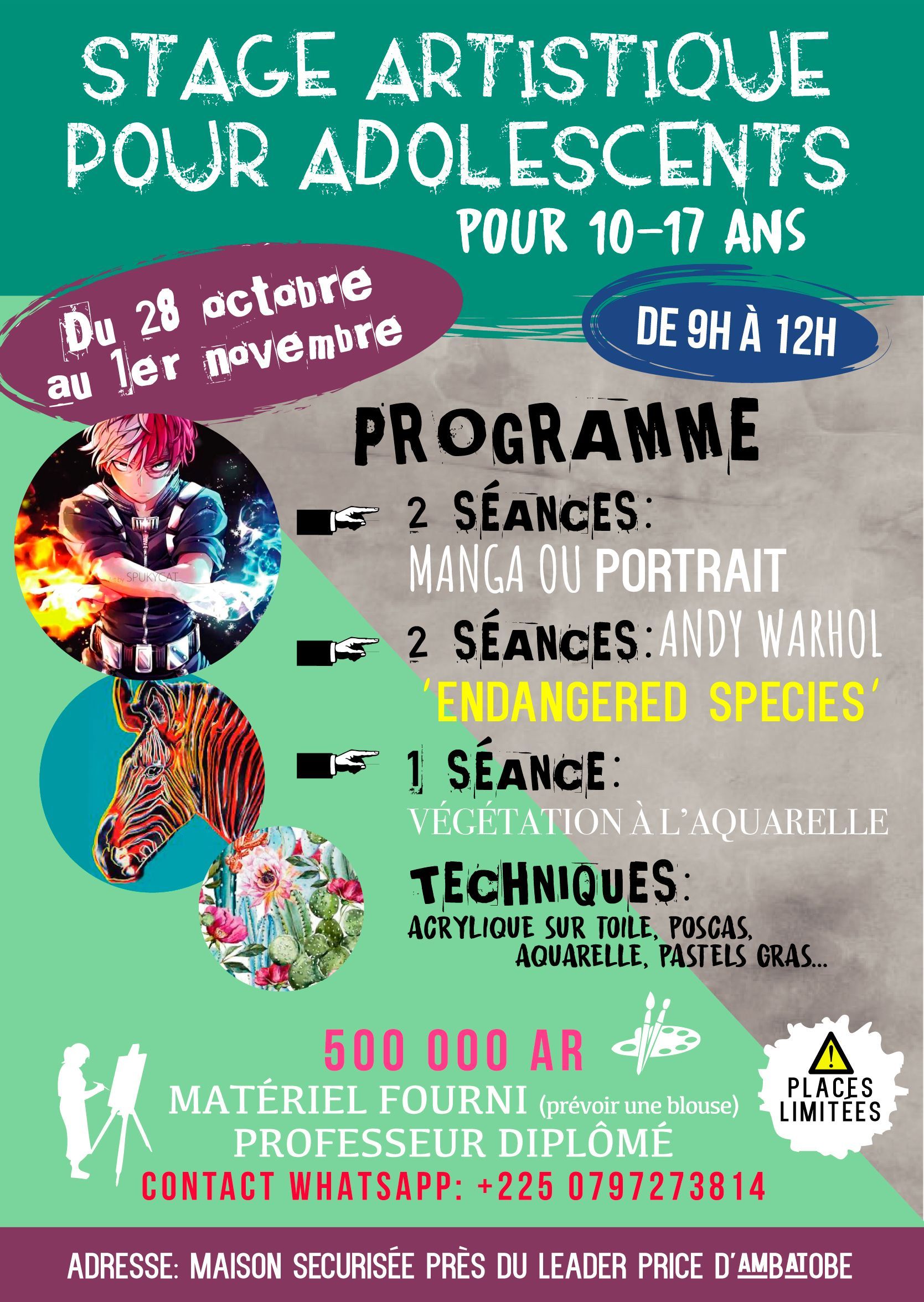 Les stages de vacances sont pour les 10 à 17 ans. Ils sont assez intenses avec un programme précis. Deux matinées sont consacrées au manga ou portrait, sur format raison, à la peinture. Deux matinées sont réservées à un peintre ou à un courant de l'histoire de l'art, avec une oeuvre peinte sur toile. La dernière matinée est destinée à travailler une technique d'atelier, comme faire sa propre peinture, s'essayer à la peinture chinoise, apprendre à utiliser les plaques de gel, faire sa propre aquarelle...