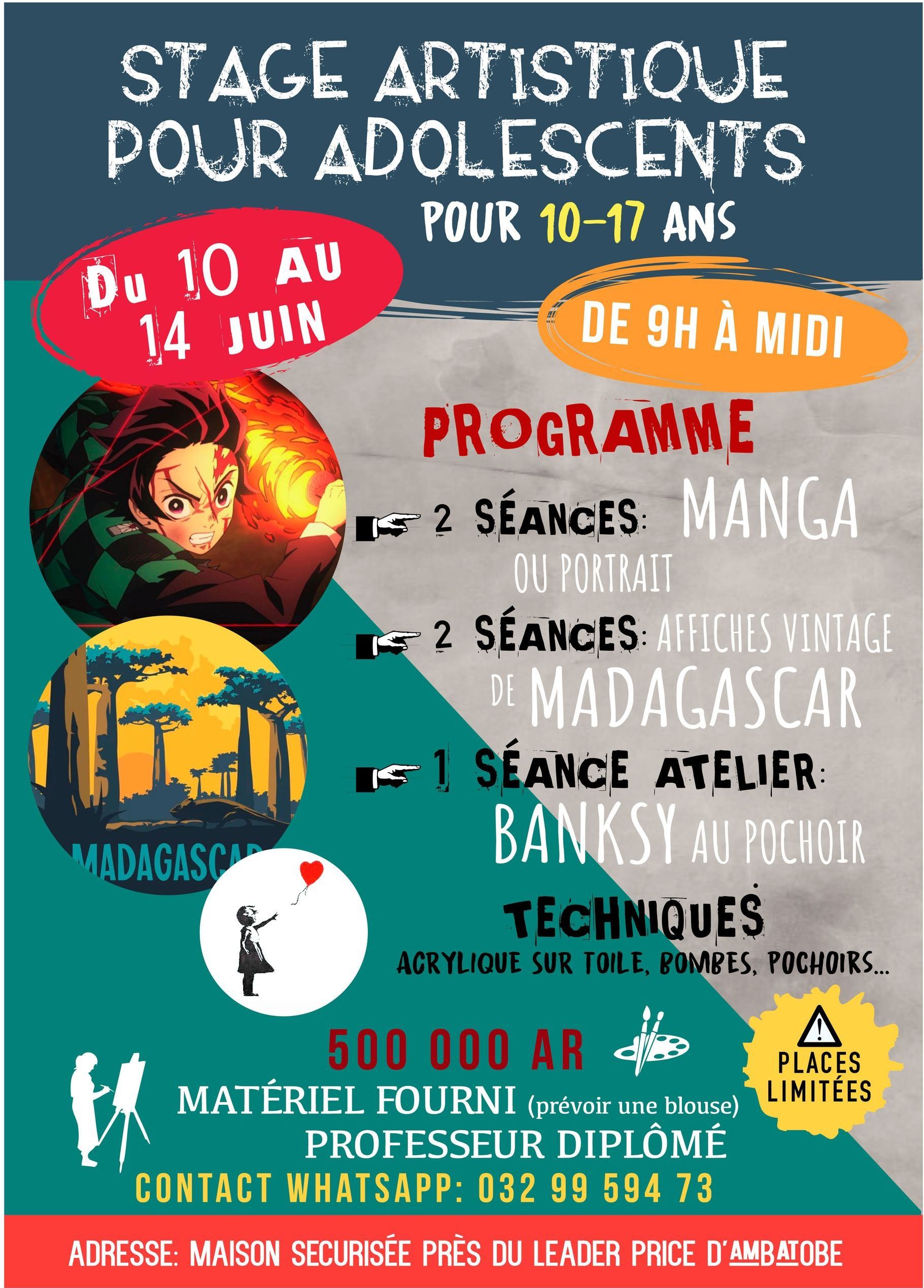 Les stages de vacances sont pour les 10 à 17 ans. Ils sont assez intenses avec un programme précis. Deux matinées sont consacrées au manga ou portrait, sur format raison, à la peinture. Deux matinées sont réservées à un peintre ou à un courant de l'histoire de l'art, avec une oeuvre peinte sur toile. La dernière matinée est destinée à travailler une technique d'atelier, comme faire sa propre peinture, s'essayer à la peinture chinoise, apprendre à utiliser les plaques de gel, faire sa propre aquarelle...